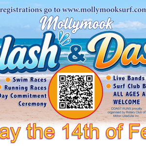 Mollymook Splash & Dash The Rotary Club of Milton-Ulladulla, in conjunction with Mollymook Surf Life Saving Club, invite you to join us for an... 14 Feb 7:00 am - 10:00 am Mollymook Surf Club 83 OCEAN STREET, Mollymook New South Wales