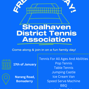 Free Tennis Open Day Free Tennis Open Day! Courts are located behind the Bomaderry bowling alley. All abilities welcome! 17 Jan 2:00 pm - 4:00 pm Shoalhaven District Tennis Association Narang Rd, Bomaderry NSW 2541