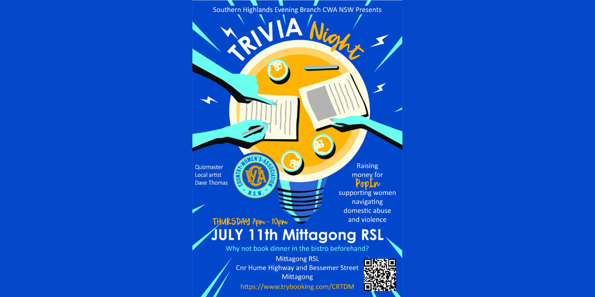 Southern Highlands Evening branch of CWA NSW are holding a Trivia Night to raise money for Pop In to support women navigating domestic abuse and violence. Why don’t you come along and join us. Tables of 10. Make up your own or we will place you with others. French themed night. Raffles galore.